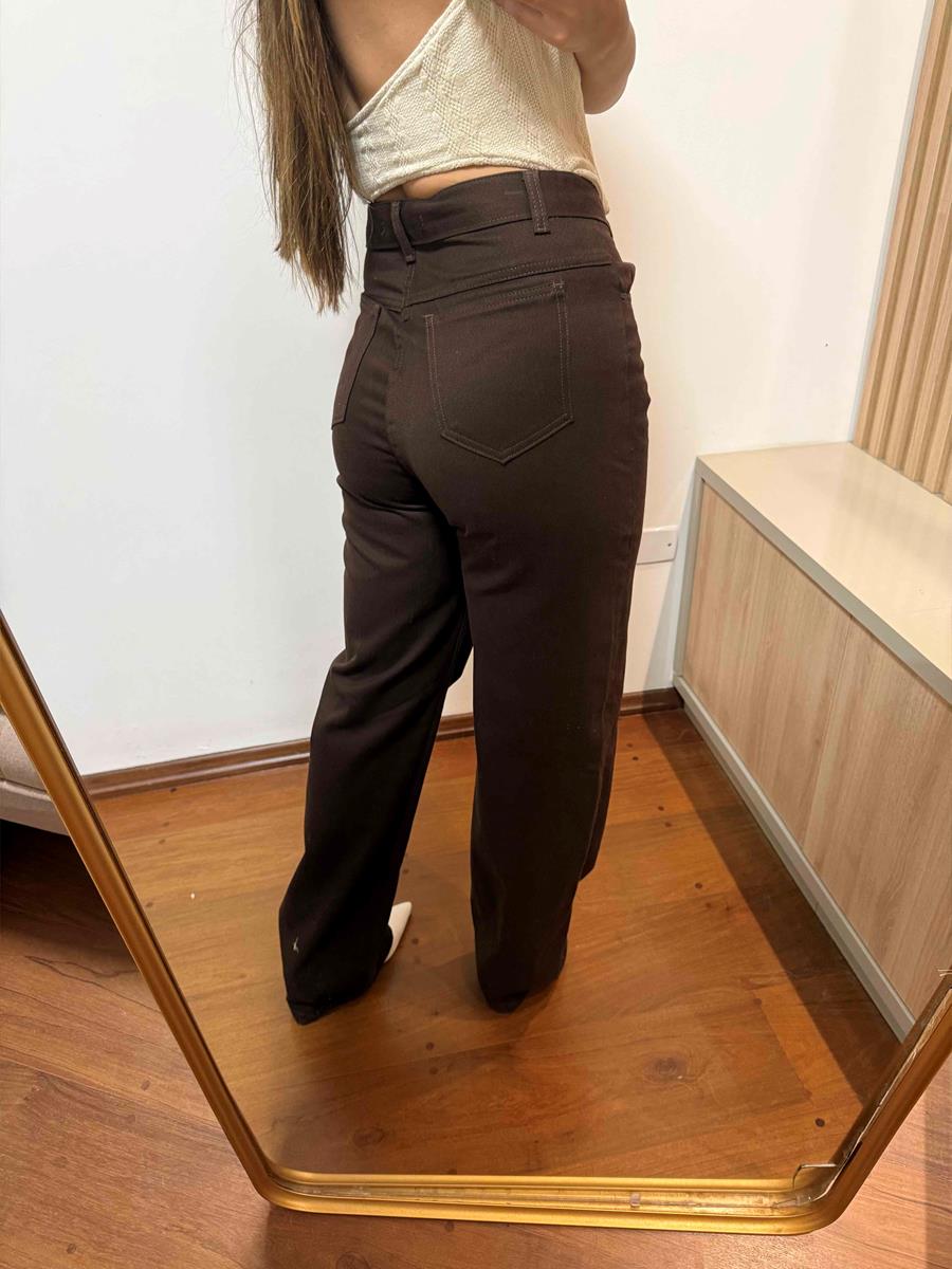 Calça wide leg jeans na cor marrom café, cintura alta.